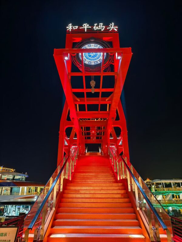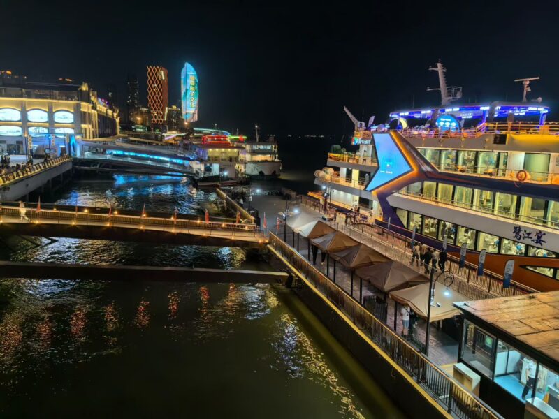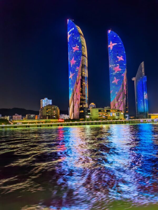 海风带着咸湿的气息掠过甲板,混着远处沙茶面摊飘来的香气。身边华侨大学的留学生们正边欣赏夜色边聊得起劲,他们指着对岸的双子塔 —— 那两座直插夜空的建筑,此刻正上演着灯光秀,闽南传统纹样与现代几何图形在玻璃幕墙上交替闪现,像一场跨越千年的对话。